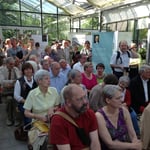 Trotz hoher Temperaturen ist das Glashaus der Hardt voller Menschen. Die rund 100 Besucher lockt zweierlei: die Buchveröffentlichung „Gartendenkmal Hardt“ und die Wanderausstellung von Heinrich Siesmayer über den bekannten Garten- und Landschaftsarchitekten, der auch die Hardt gestaltete.